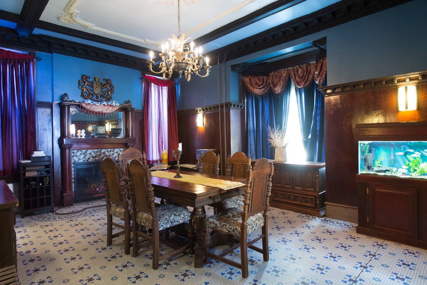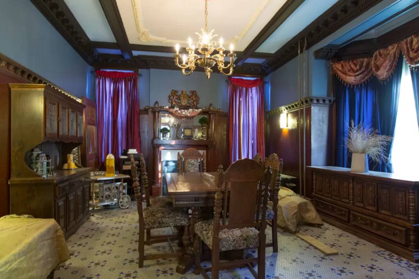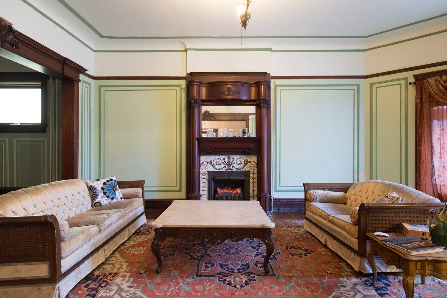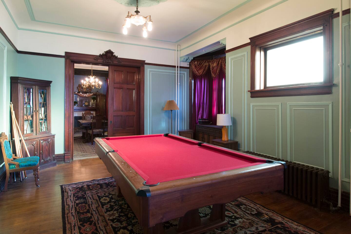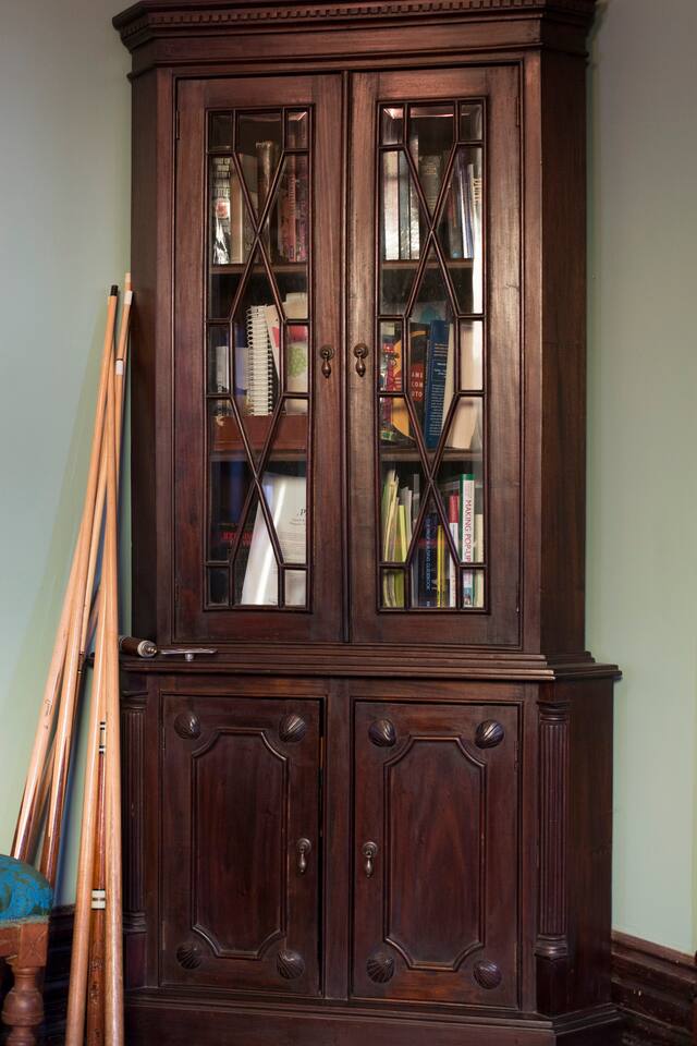 The entire home except remaining private rooms are available. This includes the kitchen, dining room, billiards room, parlor, laundry room, and of course common bathrooms.