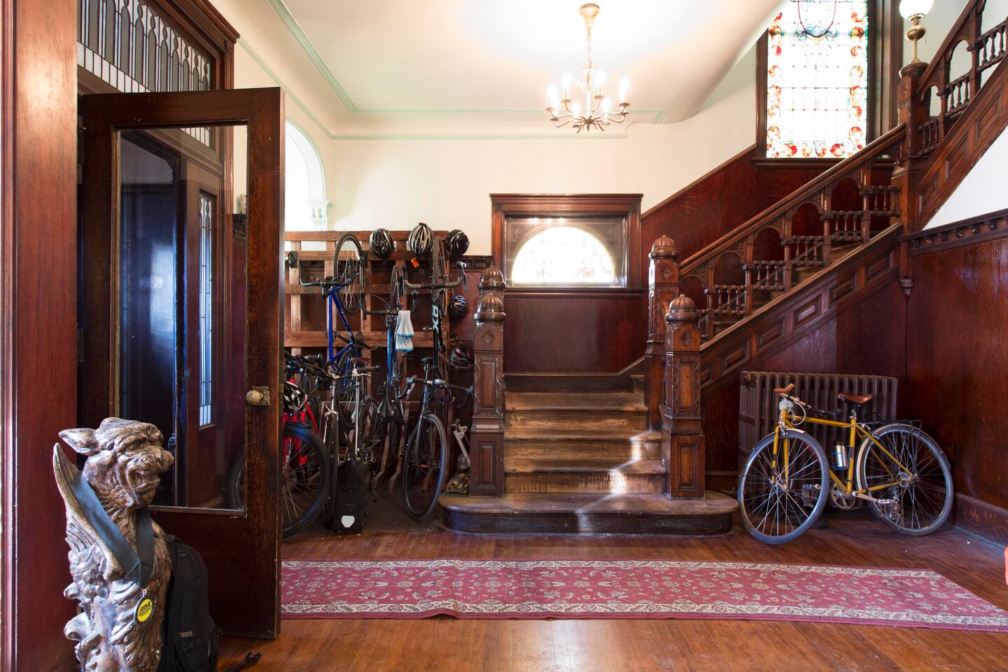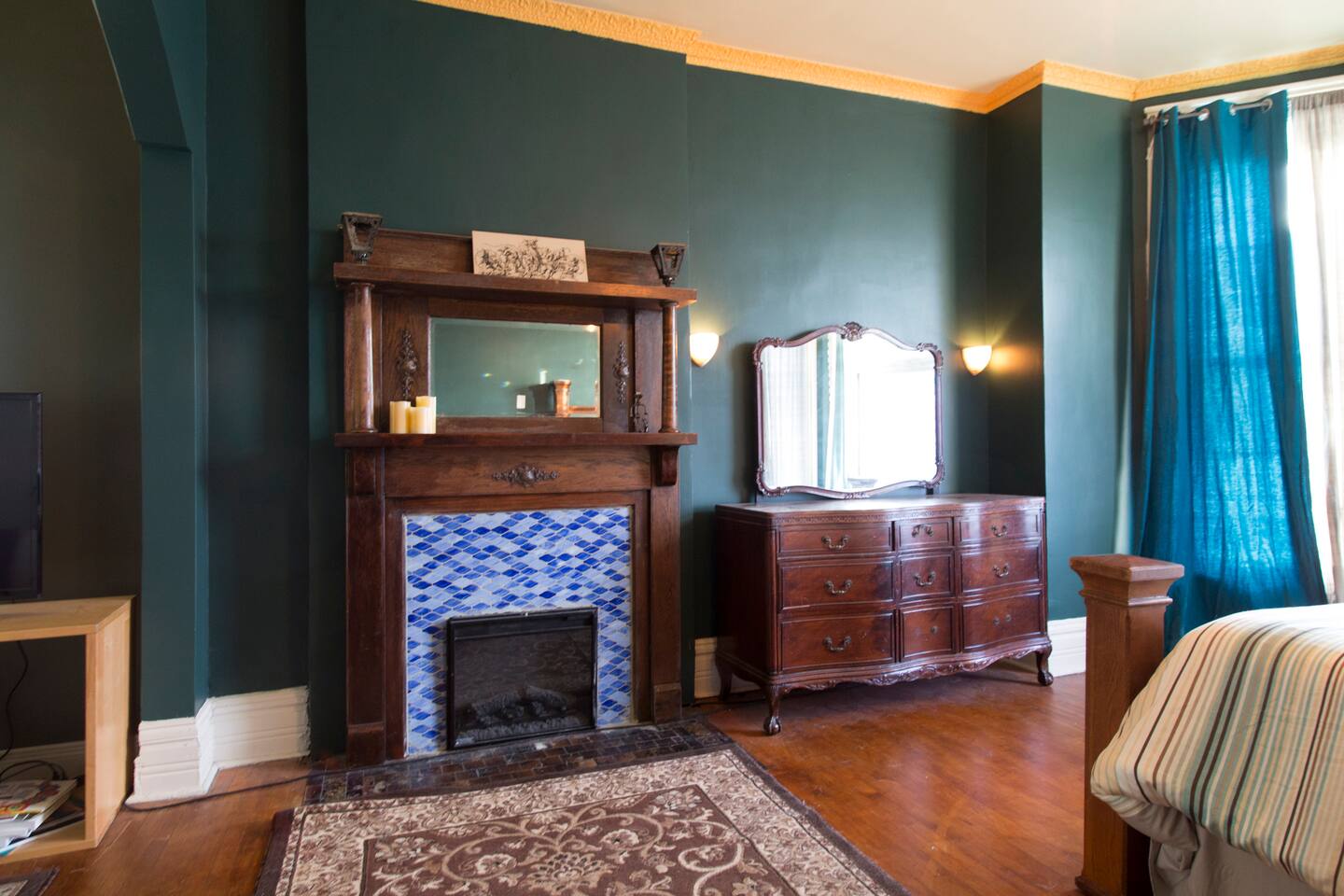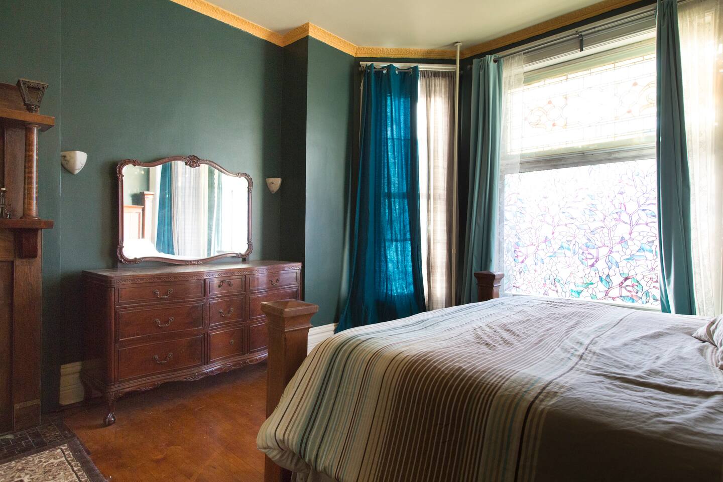 This circa 1895 Victorian Bedroom features ornate plaster work, original hardwood flooring, in-room fireplace. Easy unmetered street parking is readily availabe. You will have full access to the kitchen cooking and free Keurig coffee. You have a private mini fridge in your room for food storage. There are multiple common areas on the 1st, 2nd, and 3rd floors including Dining, Living, TV, and Recreation rooms. The house is one block from the Kedzie Green line rail station.