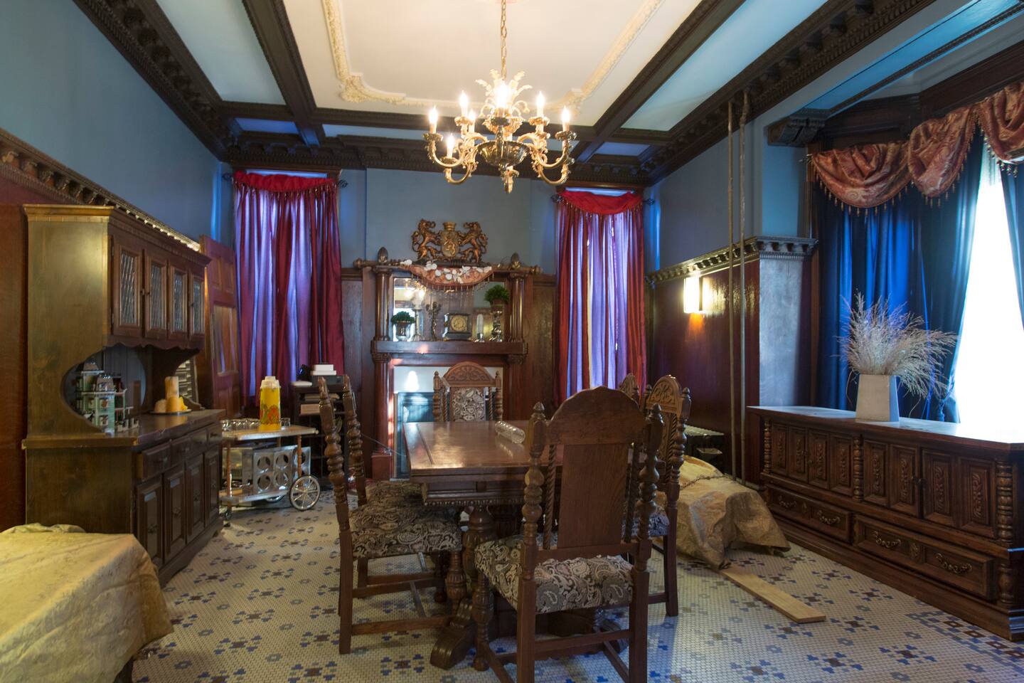 The entire home except remaining private rooms are available. This includes the kitchen, dining room, billiards room, parlor, laundry room, and of course common bathrooms.