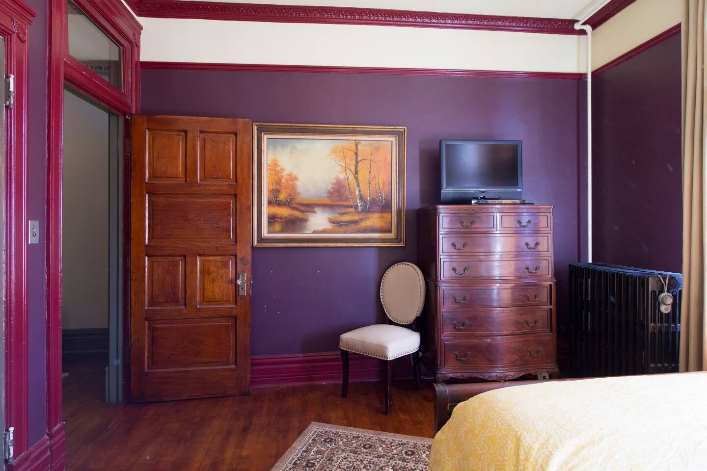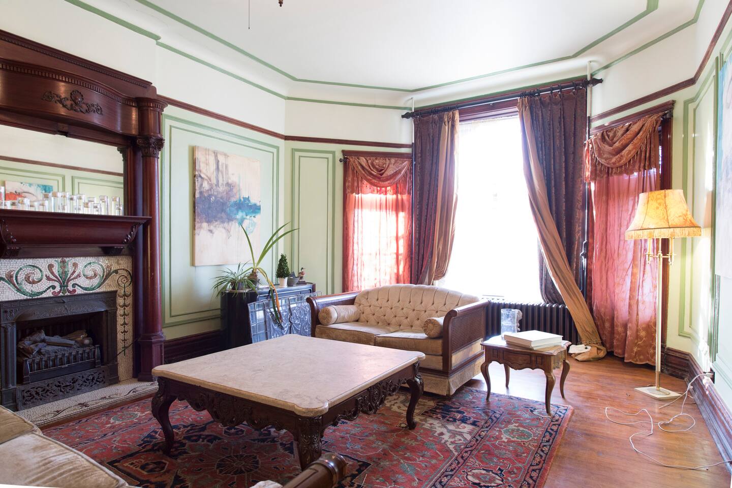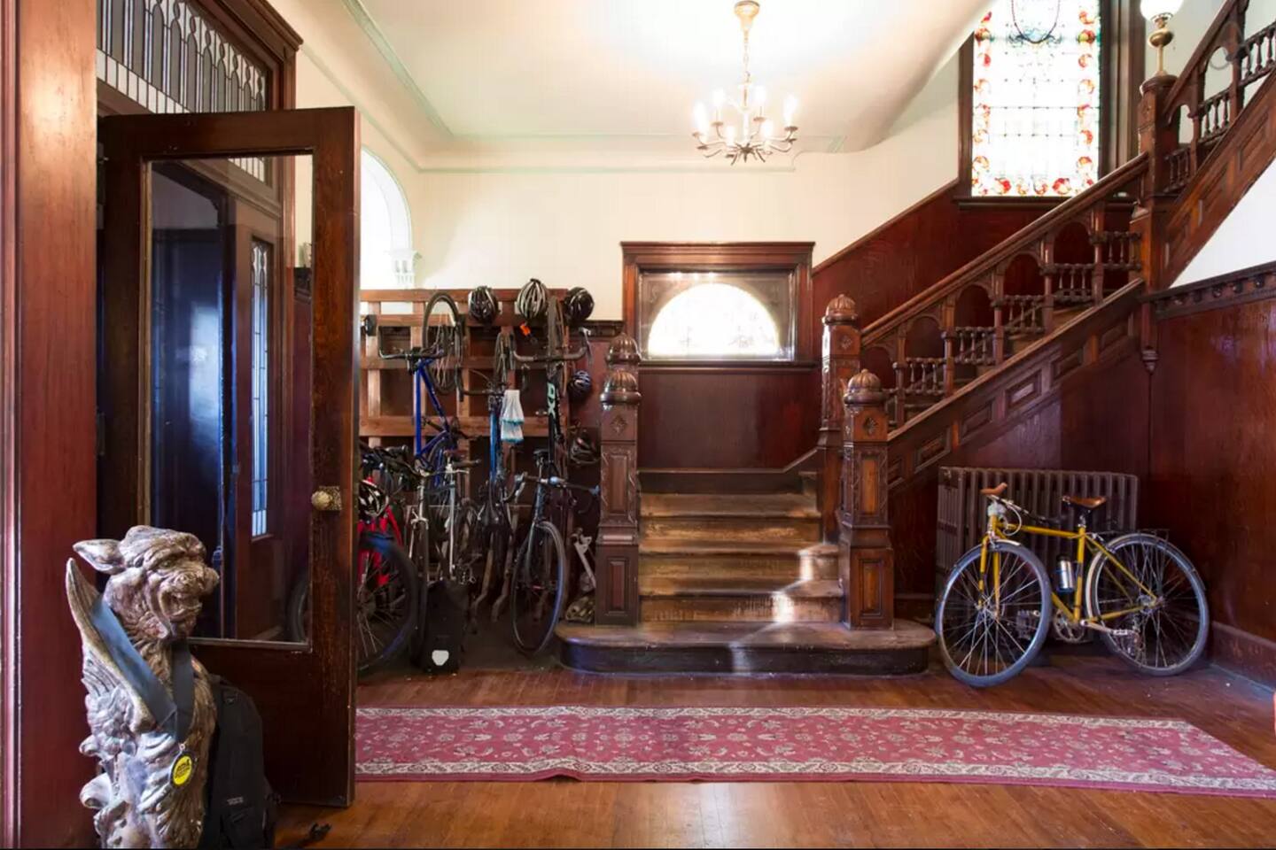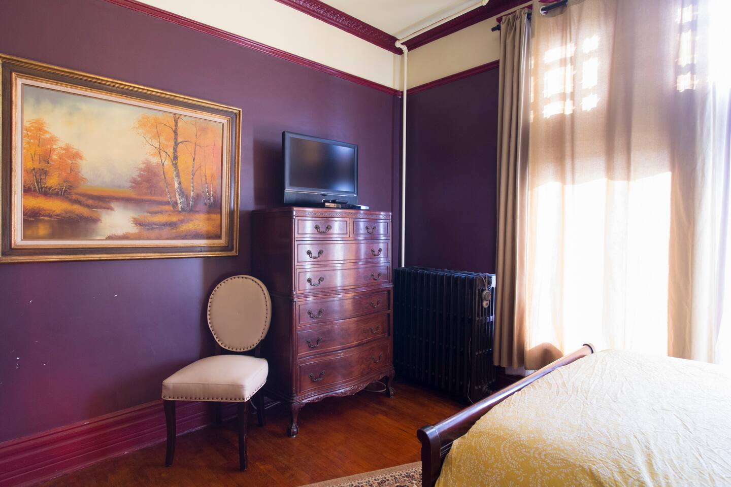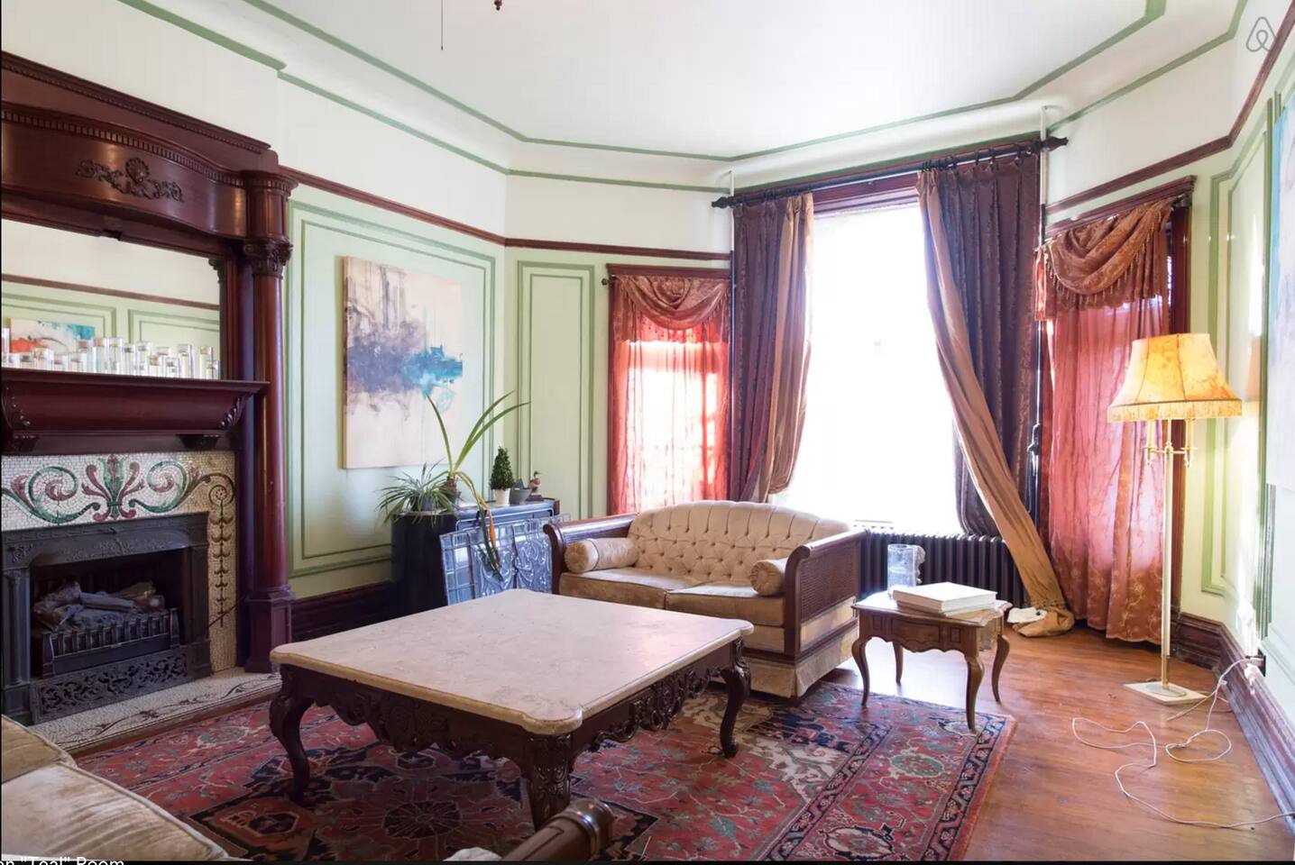 This room overlooks the widow's walk with victorian styled floor to ceiling windows in a historic ornate room. Easy non metered street parking out front. You will have full access to the kitchen cooking and free Keurig coffee. You have a private mini fridge in your room for food storage. There are multiple common areas on the 1st, 2nd, and 3rd floors including Dining, Living, TV, and Recreation rooms. The house is one block from the Kedzie Green line rail station.